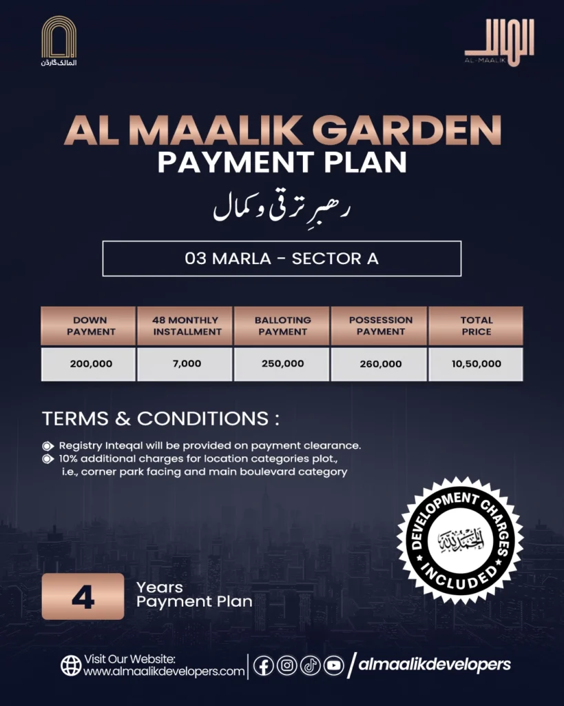 One of the strongest attractions of Al Maalik Garden is its affordable payment plan.