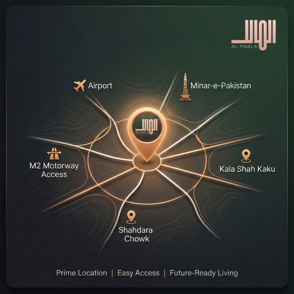 The location of Al Maalik Town Lahore is one of its strongest selling points. The project is situated on Kala Khatai Road, a rapidly developing area known for excellent connectivity and future growth.