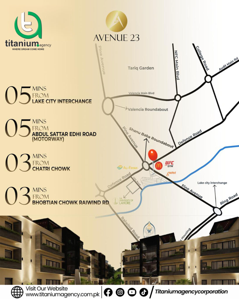 Avenue 23 is strategically located at Defence Road, Pine Avenue, Shanu Baba Chowk, Lahore, offering unmatched accessibility: