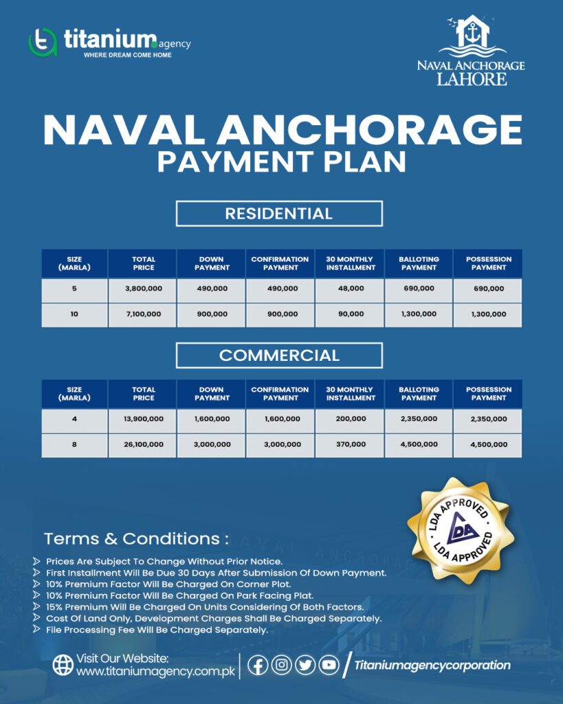 Naval Anchorage Lahore offers a range of residential and commercial plots, catering to both investors and families: